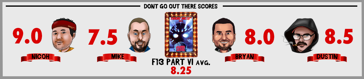 Nicoh, Mike, Bryan and Special Guest Dustin are back to review the 1986 fan favorite, Friday the 13th Part VI: Jason Lives. From Alice Cooper's music to CJ Graham's machete kills, this movie is pure fun and you'll hear all about it on this episode. Check out our twitter account (@dontgooutthere), facebook (facebook.com/dontgooutthere/) and Instagram (dontgooutthere_) for give-aways and much much more! Thank you for listening, don't forget to subscribe and rate us on all of our platforms!